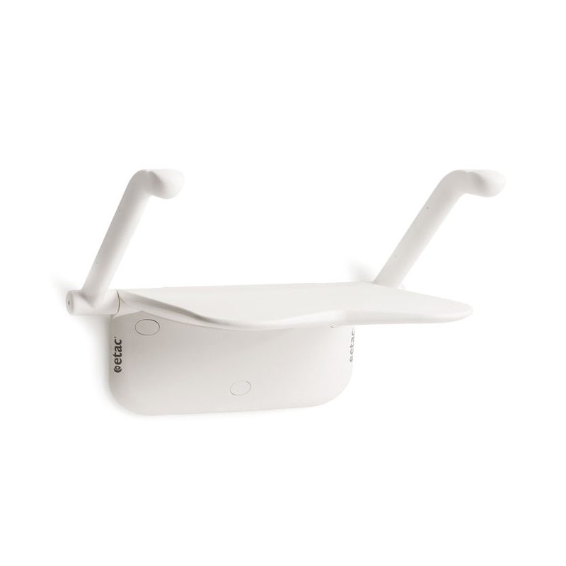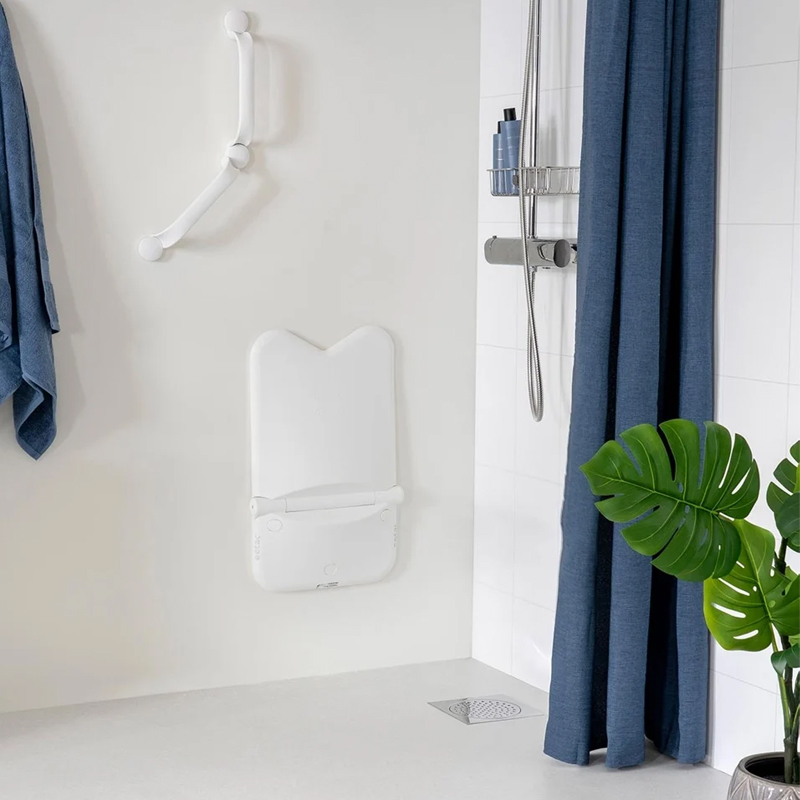 Der klappbare Wandduschsitz Relax mit Armlehnen ist die ideale Lösung für kleinere Duschen und Badezimmer, die keinen Platz für einen Duschstuhl bieten. Er lässt sich äusserst platzsparend an der Wand montieren. Im hochgeklappten Zustand benötigt der Wandduschsitz praktisch keinen Raum.Ausgeklappt bietet er die Möglichkeit, im Sitzen zu duschen, für mehr Sicherheit bei der Körperpflege. Die weiche Oberfläche ist glatt, bequem zum Sitzen und rutschfest bei Nässe. Ergonomisch geformte, klappbare Armlehnen bieten zusätzlichen Halt und grösstmöglichen Komfort. Produktdetails des Wandduschsitzes Relax mit Armlehnen: