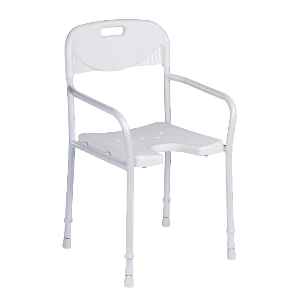 Der stabile Duschstuhl 94 ohne Sitzpolster ermöglicht Menschen mit eingeschränkter Mobilität eine Körperpflege im Sitzen. Die Rückenlehne und Armlehnen geben sicheren Halt beim selbständigen Waschen oder beim Gewaschen werden. Ein Hygieneausschnitt im Sitz ermöglicht die hygienische Pflege intimer Bereiche. Produktdetails: