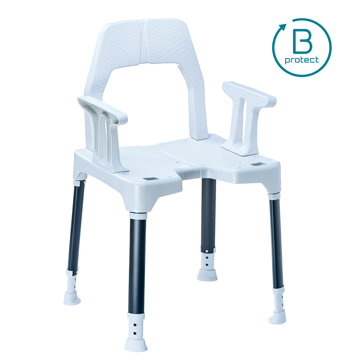 Der Duschstuhl bzw. Duschhocker TAYO überzeugt in einem modularen Design mit sinnvoll gestalteten Komponenten. Das einfache Stecksystem erlaubt alle Varianten, ob mit oder ohne Armlehnen, als Stuhl oder als einfacher Hocker. Der Hygieneausschnitt lässt sich durch ein Umstecken der Rückenlehne nach vorne oder hinten ausrichten.Die intelligente Formgebung der Gummifüsse, platzsparend nach innen ausgerichtet, sorgt für kompakte Aussenabmessungen und gleichzeitig für erhöhte Rutschsicherheit. Die innovative, schmutz- und wasserabweisende Softtouch Oberflächenstruktur garantiert eine einfache Reinigung und bietet dem Anwender einen sicheren Halt. Produktdetails:
