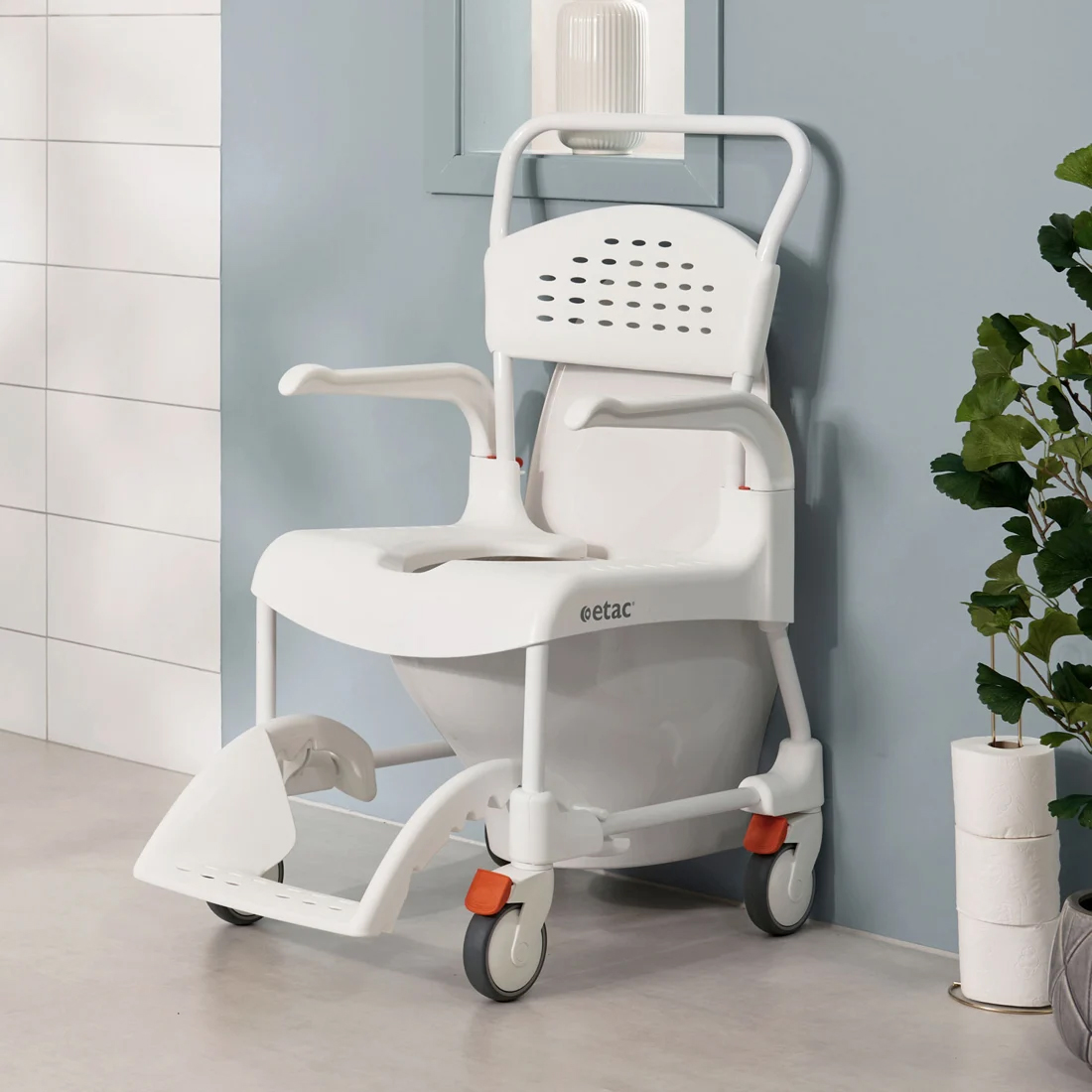 Der Duschtoilettenstuhl Clean mit fixer Sitzfläche vereinfacht die Nutzung von Dusche und Toilette für pflegebedürftige Personen. Dank seines ergonomischen Schiebegriffs ist er äusserst leicht zu steuern. Die Form des Schiebegriffes stellt sicher, dass der Clean immer perfekt passt, auch über wandhängende Toiletten. Der Stuhl ist nach hinten geöffnet für einen erleichterten Zugang.Die einzigartige Fussstütze kann unter den Sitz geschoben werden, wenn sie nicht gebraucht wird. Die sanft geschwungene Form bietet guten Komfort für die Füsse, bei gleichzeitiger Sicherheit durch den Seitenschutz.Wählen Sie unten Ihre Wunschfarbe und Sitzhöhe aus. Details zum Duschtoilettenstuhl Clean mit fixer Sitzhöhe: