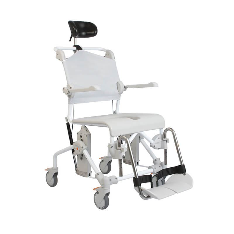 Neigungsverstellbarer mobiler Duschtoilettenstuhl aus Leichtmetall, geeignet zum Duschen und für Toilettenbesuche von pflegebedürftigen Personen. Beschreibung: