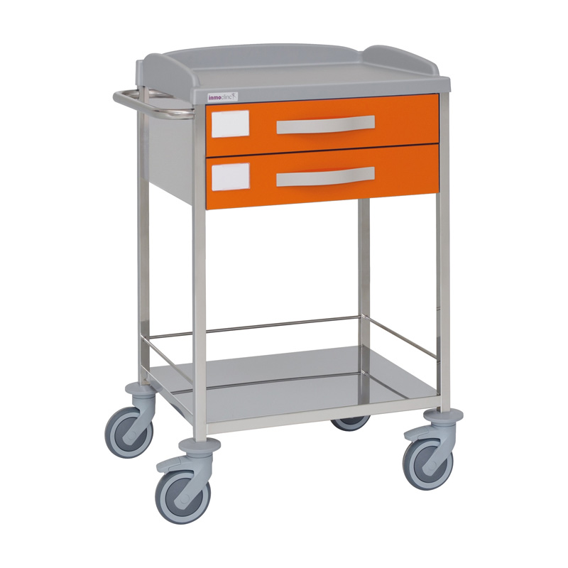 Praktischer Transportwagen für den Einsatz in der Pflege mit zwei selbstschliessenden Schubladen, ABS Arbeitsfläche und leichtlaufenden Lenkrollen (zwei davon mit Bremse).