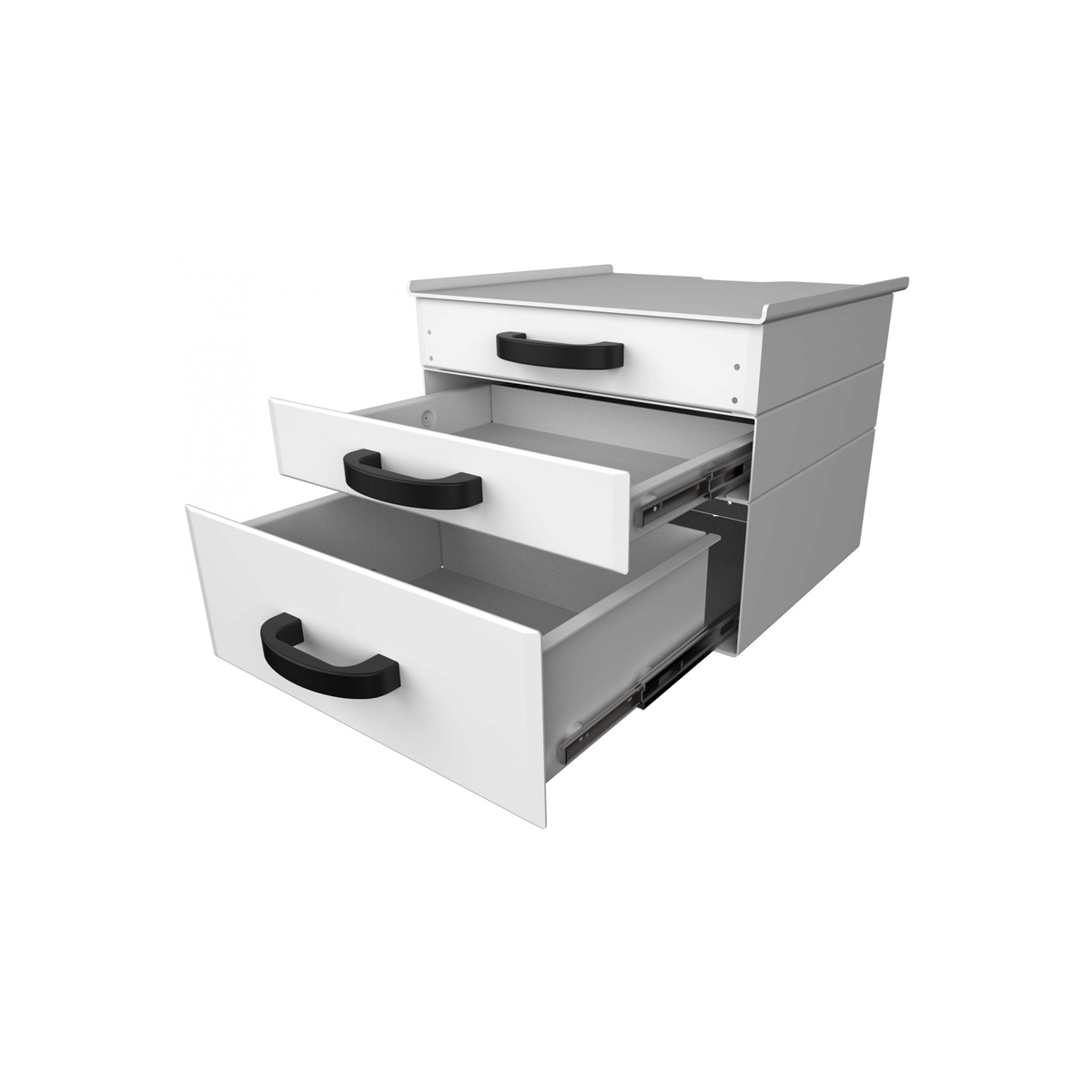 Schubladen sind ein wichtiges Zubehörteil für Computerwagen der ZG-MedCart Pro Serie, denn sie komplettieren den Wagen zu einem effizienten Arbeitsplatz. Sie lassen sich schnell und einfach an den ZG-MedCart Pro 4 und Pro 6 Computerwagen anbringen. In unserem Sortiment sind Schubladen in verschiedenen Abmessungen erhältlich. Die robusten Schubfächer bieten optimalen Stauraum für Dokumente, Pflegehilfsmaterialien oder anderes Material. Produktdetails zu 3-fach Schubladen für Computerwagen: