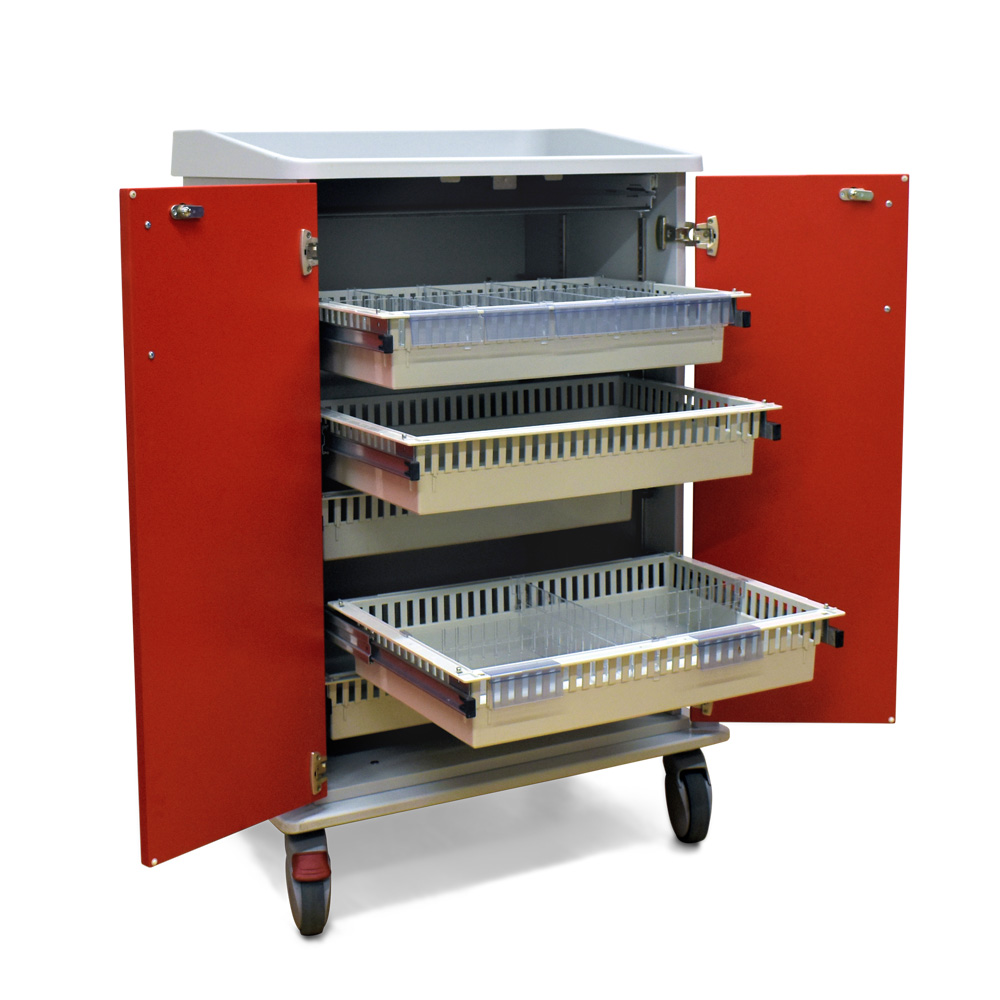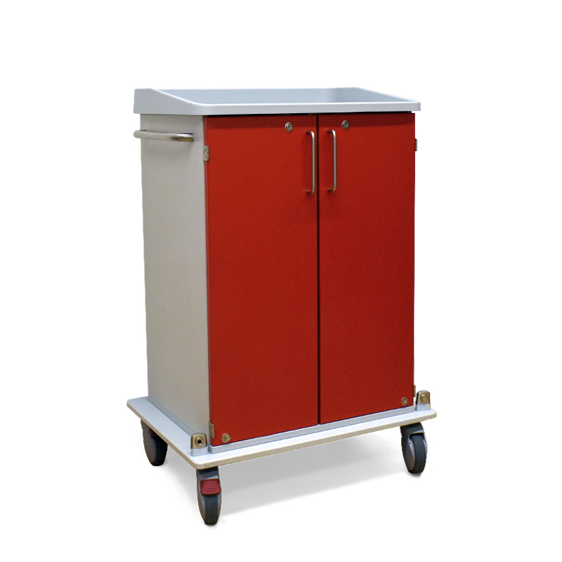 Hochwertiger Medikamentenwagen "Blister" für die Verteilung von Medikamenten an bis zu 20 Bewohnerinnen und Bewohner in Pflegeeinrichtungen. Das Fahrgestell besteht aus einer durchgehenden Vollkunststoffplatte. Diese dient gleichzeitig als Wandabweisrahmen. Das Schrankteil ist aus hochwertigen Spezialplatten der Qualitätsklasse E 1 mit einer beidseitigen Melaminharzbeschichtung und einem 2 mm dicken ABS-Sicherheitsumleimer gefertigt. Bitte Fragen Sie uns an für eine Offerte oder Probestellung. Viele weitere Ausführungen und Zubehör sind erhältlich. Details zum Produkt: