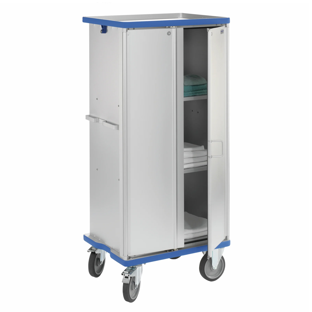 Unsere geschlossenen Schrankwagen aus eloxiertem Aluminium zeichnen sich durch höchste Stabilität und Festigkeit sowie eine hochwertige Verarbeitung aus. Für eine leichte Handhabung, befindet sich pro Schmalseite je ein massiver Schiebegriff.Die Wagen werden mit Schilderrahmen DIN A4 und DIN A7 für Warenbegleitkarten ausgestattet, die Zwischenböden sind herausnehmbar. Produktdetails des geschlossenen Schrankwagens: