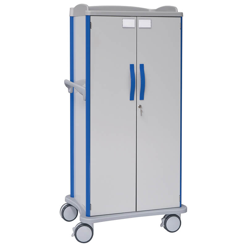 Dieser Schrankwagen kann individuell bestückt werden, mit Korbeinätzen z.B. für medizinisches Material, Pflegematerial oder Medikamente, mit Meditabletts für die tägliche Medikamentenversorgung oder mit Tablaren zum einräumen von diversem Material, Wäsche oder anderen Gegenständen.