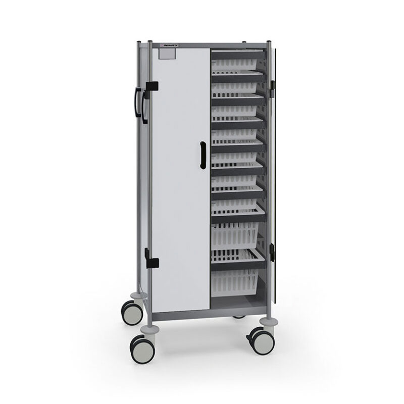 ZF-GRANDE ISO Transport- und Aufbewahrungswagen für Material. Der Transportwagen für die flexible, individuelle Organisation in Spital und Klinik. Modernes Design, robuste Konstruktion, vielseitige Ausstattungsmöglichkeiten. Auch voll beladen leicht fahr- und manövrierbar durch grosse, feststellbare Laufrollen.