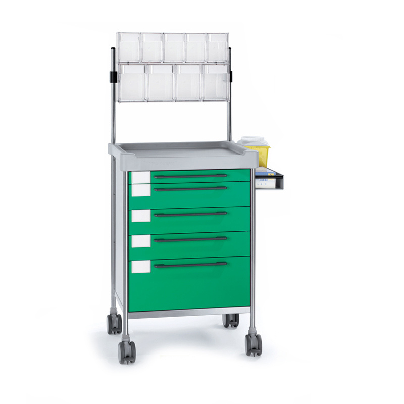 Der ZF-Pflegewagen mit höhenverstellbaren 4er- und 5er- Schüttenspender sowie rechtsseitigem Ablagekasten ist ideal für Spitäler und Pflegeeinrichtungen, um einen effizienten und organisierten Arbeitsalltag zu gewährleisten. Mit seiner stabilen Edelstahlkonstruktion, hygienischen Polyethylen-Arbeitsplatte und ISO-Schubladen unterstützt der Pflegewagen die strukturierte Lagerung von Materialien. Dieser ZF-Pflegewagen ist ausgestattet mit:
