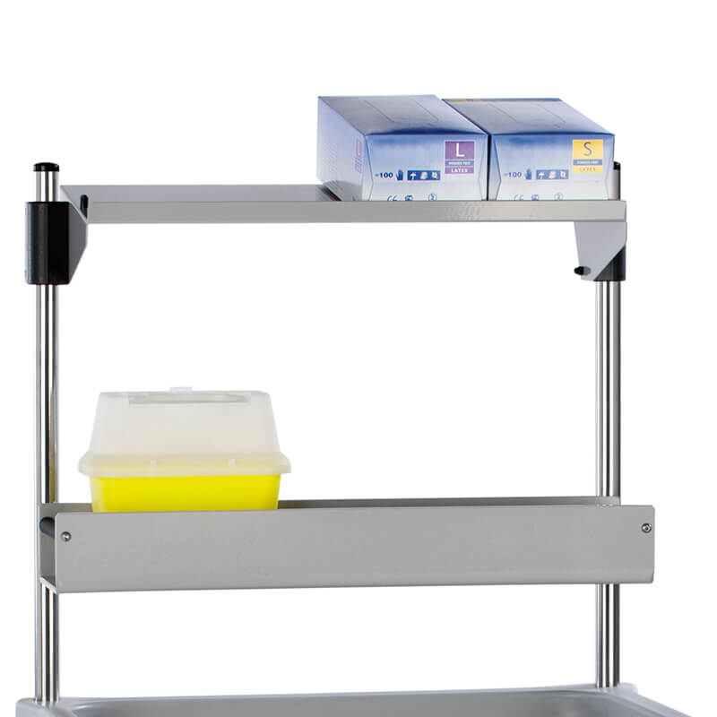 Der Galerieaufsatz für Funktionswagen der ZQ-Serie bietet zusätzliche Ablageflächen für mehr Ordnung und Flexibilität im Pflegealltag. Er ist in Varianten mit und ohne Desinfektionsmittelspender erhältlich, wobei das höhenverstellbare Ablagetablett und die feste Ablagebox für eine effiziente Nutzung und besseren Zugriff sorgen. Produktdetails des Galerieaufsatzes: