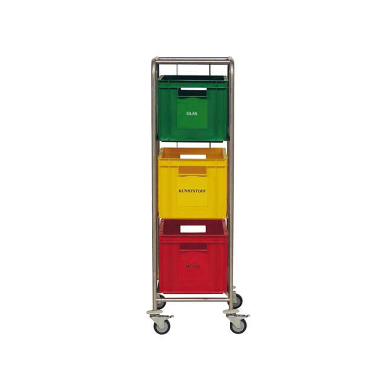 Wertstoffsammler aus Edelstahl mit drei Kunststoffkästen 300x400x270 mm (im Lieferumfang enthalten) und vier Lenkrollen, davon zwei mit Stoppfunktion. Produktbeschreibung: