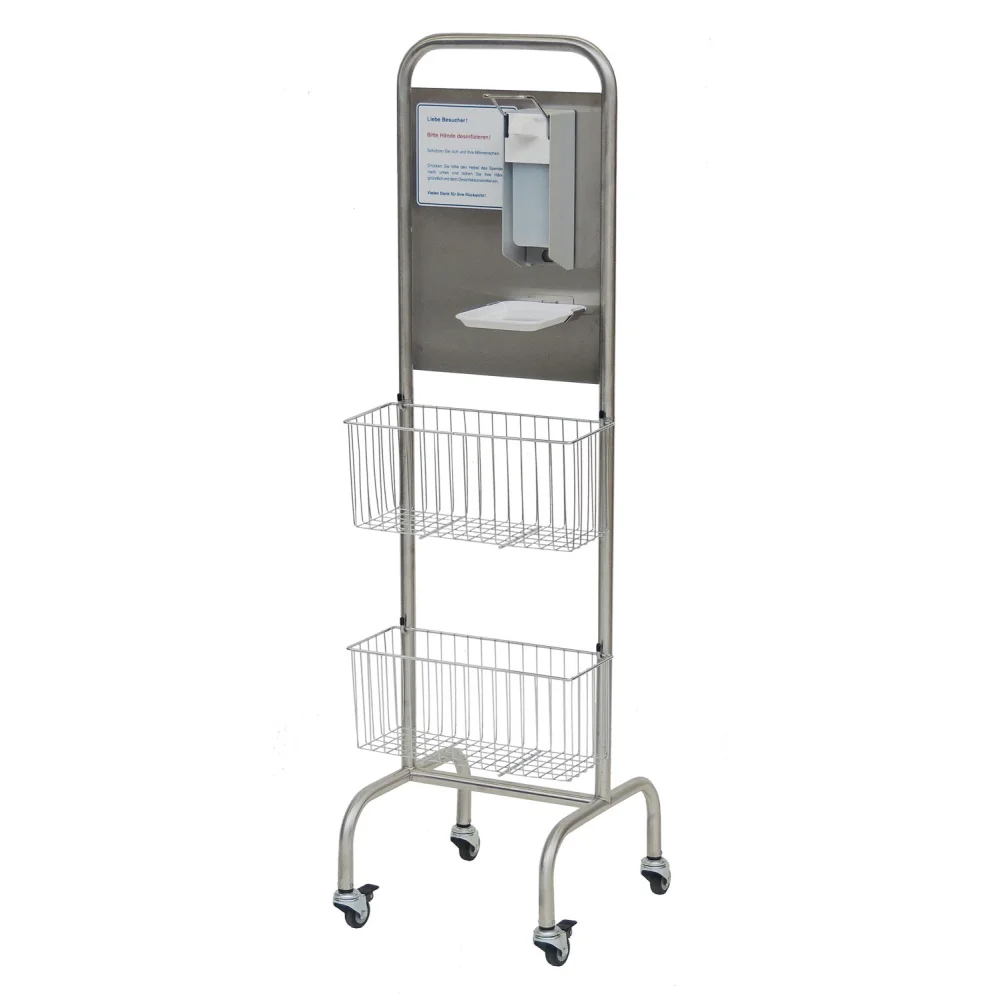 Das Hygienecenter DESI ist an jedem Ort problemlos einsetzbar und bietet für die Händedesinfektion ideale Voraussetzungen. Komplett aus Edelstahl gefertigt, ist das Hygienecenter korrosions-, säure- und temperaturbeständig. Das erleichtert eine hygienische Reinigung dieses Centers. Alle Rohrverbindungen sind aus Rundrohr. Sie sind rundum verschweisst und poliert.An der integrierten Edelstahlplatte des Hygienecenters können Hinweisschilder mit Desinfektionsanleitung und/oder Zubehör nach individuellen Wünschen angebracht werden. Produktdetails zum Desinfektionsmittelständer DESI, fahrbar: