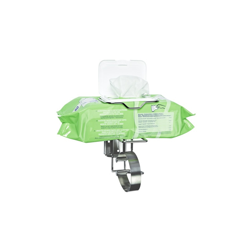 Robuste Edelstahl-Wandhalterung zur praktischen Aufbewahrung von Desinfektionstüchern in Flowpacks. Diese Halterung sorgt für einen sicheren Halt der Flowpacks und ermöglicht eine einfache und hygienische Entnahme einzelner Tücher. Produktdetails der robusten Edelstahl-Wandhalterung: