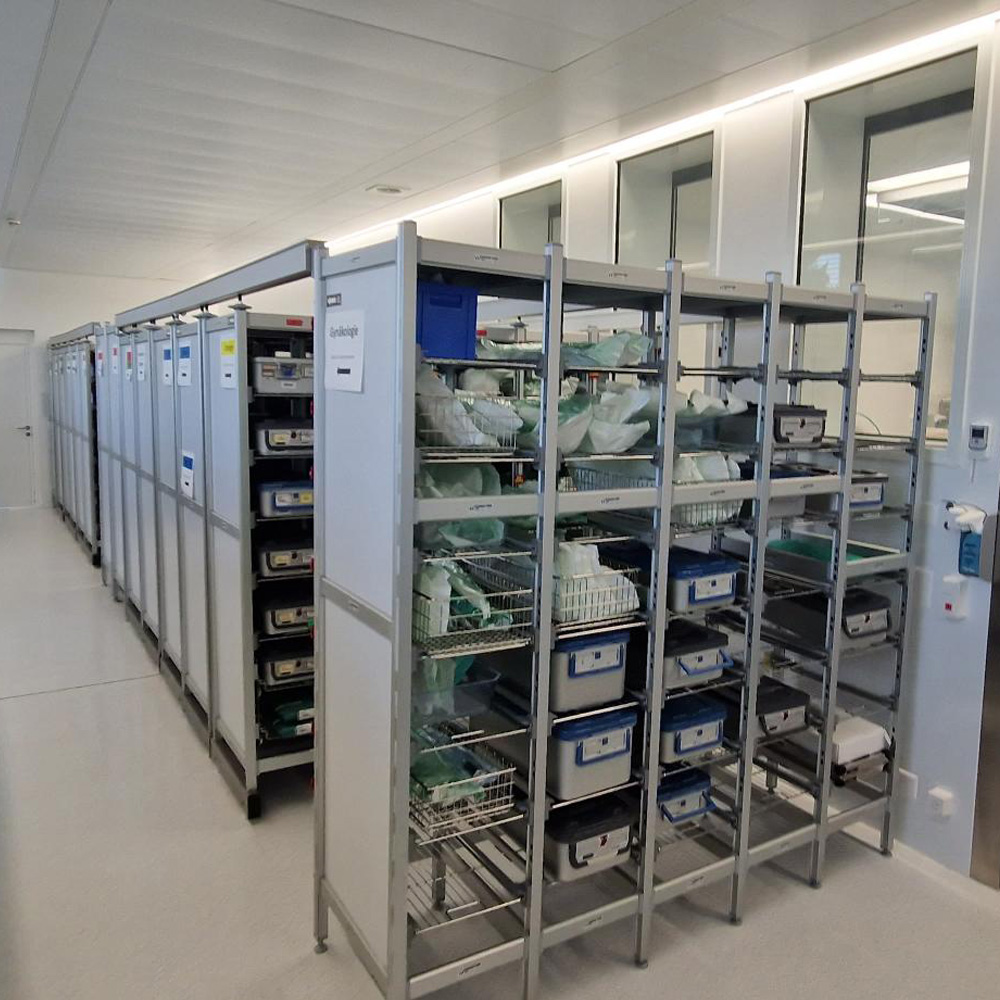 Das System eignet sich ideal für die vorschriftsmässige Lagerung von Sterilgut, medizinischen Produkten und Geräten in Spitälern z.B. im OP- und Sterilgutbereich. Es kann individuell auf die Bedürfnisse und Platzverhältnisse Ihrer Einrichtung angepasst werden. Fragen Sie uns an!