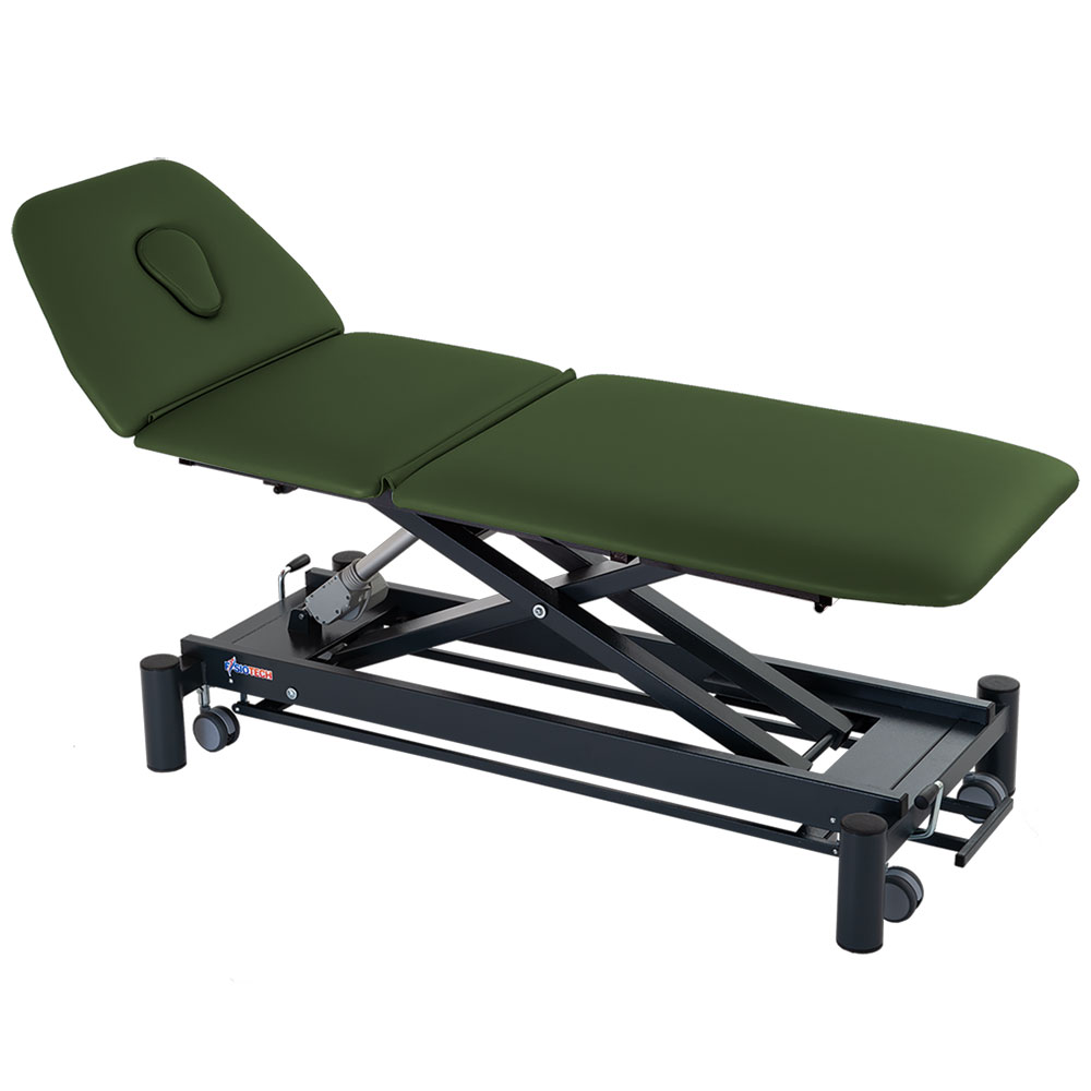 Professionelle, dreiteilige Liege für Behandlung, Massage und Untersuchung. Die Höhenverstellung erfolgt elektrisch mittels rundumlaufendem Fuss-Schaltbügel. Diese Top-Series Liege hat beim Verstellen der Höhe keinen seitlichen Versatz und benötigen daher weniger Platz. Sie ist daher auch besonders für kleinere Praxen und Räumlichkeiten geeignet. Das Gestell ist in den Farben RAL 7016 Anthrazitgrau und RAL 7035 Lichtgrau erhältlich. Produktdetails: