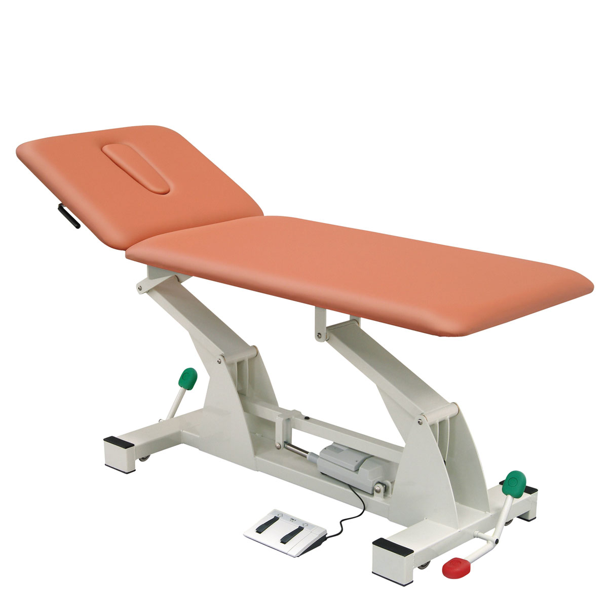 Die 2-teilige Therapieliege ist elektrisch höhenverstellbar über ein Fusspedal. Sie ist in zwei Grössen und jeweils mit oder ohne Transportrollen erhältlich. Die Therapieliege wurde so konstruiert, um maximalen Patientenkomfort und optimalen Zugang für eine einfache Behandlung zu ermöglichen.