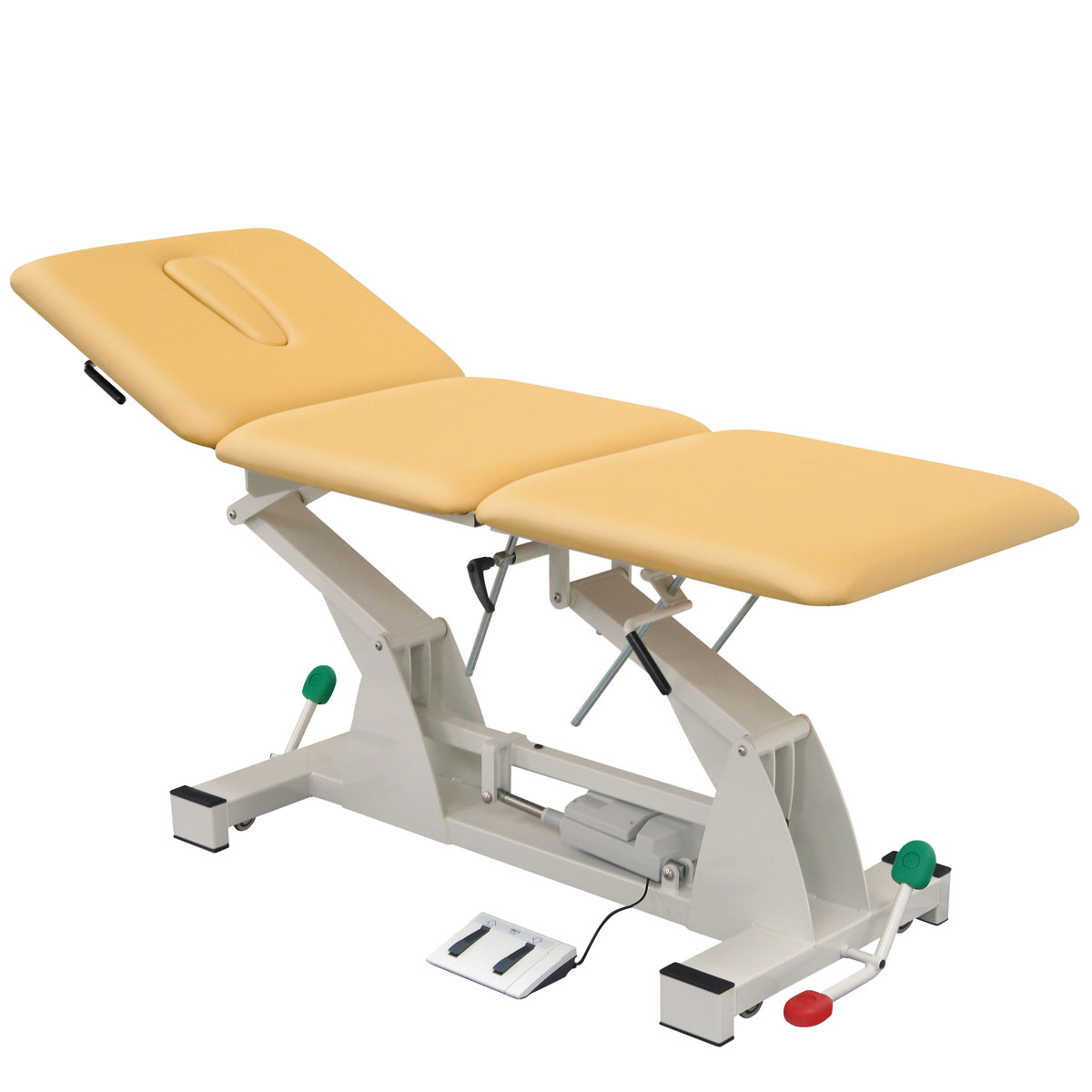 Die 3-teilige Therapieliege ist elektrisch höhenverstellbar. Sie ist sehr stabil und bietet maximalen Patientenkomfort sowie optimalen Zugang für eine einfache Behandlung. Dank der dreiteiligen Liegefläche kann die Liege auch in eine Sitzposition gebracht werden.
