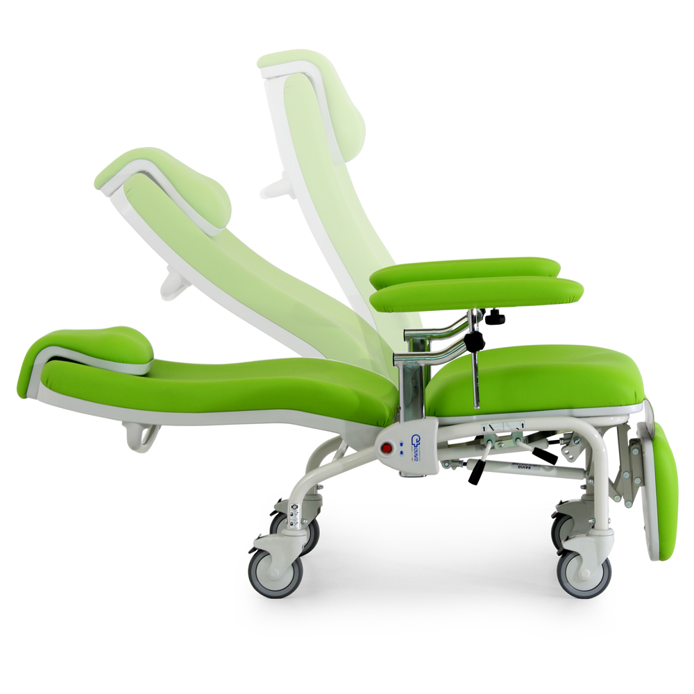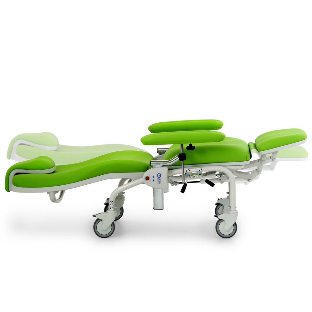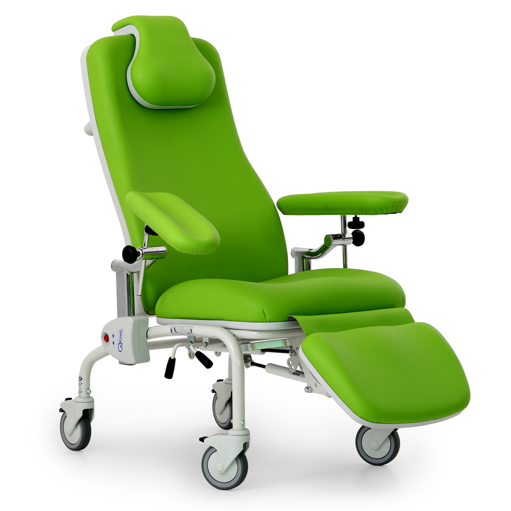 Dieses Standardmodell des Dormo Blutentnahmestuhls besitzt höhenverstellbare, ausschwenkbare, gepolsterte Armlehnen für eine ideale Positionierung der Arme bei der Blutentnahme. Die funktionen des Stuhls sind hydraulisch verstellbar und er verfügt über die nützliche Trendelenburg-Funktion. Die abgebildete Kopfstütze ist separat erhältlich sowie eine Reihe weiteren Zubehörs. Ausstattung des Blutentnahmestuhls Dormo:
