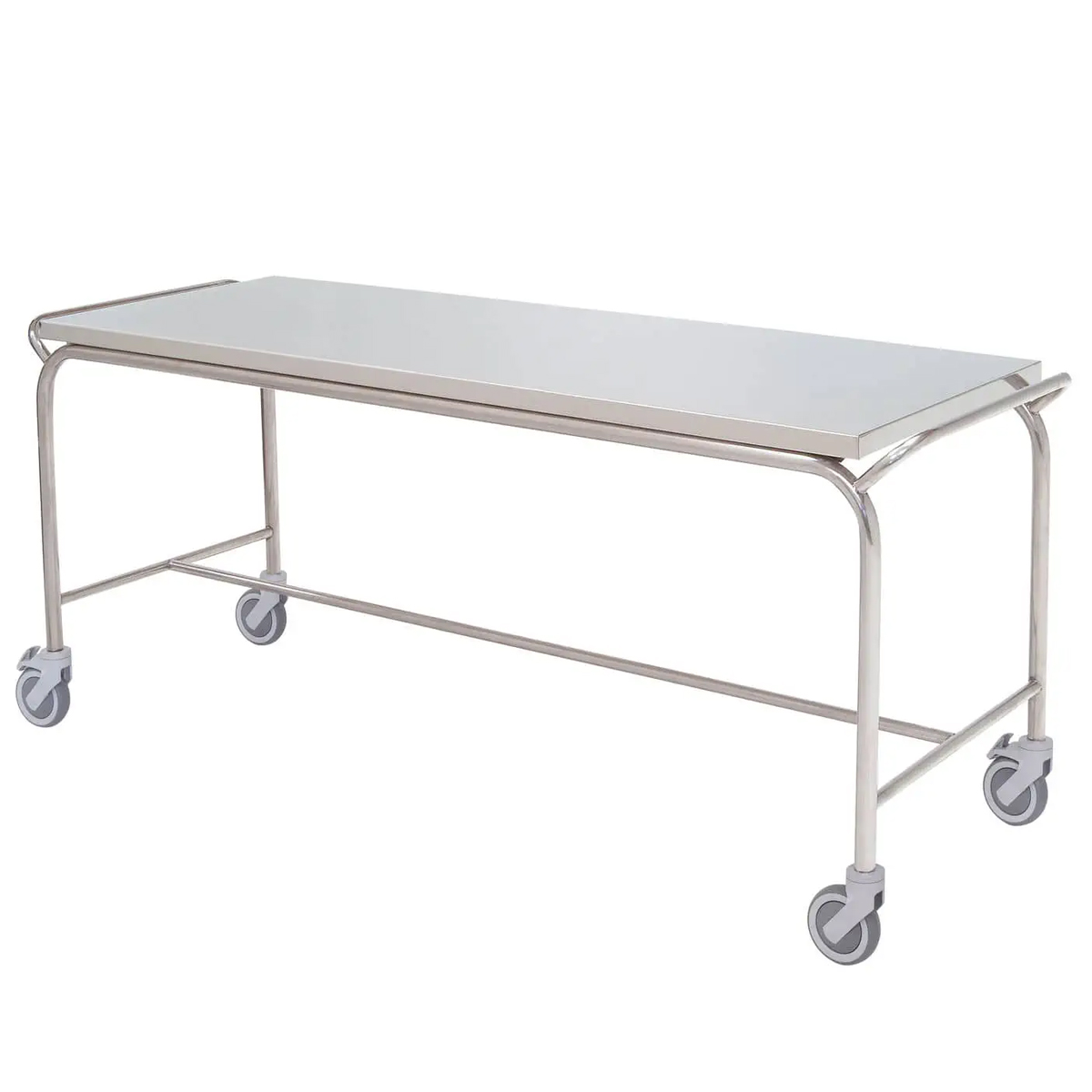 Der Leichentransportwagen mit zwei Schiebegriffen ist ideal für den sicheren und effizienten Transport von Verstorbenen. Seine robuste Struktur aus rostfreiem Edelstahl (18/8 AISI 304) sowie das strapazierfähige Kunststoffgehäuse der Räder sorgen für Langlebigkeit und eine einfache Wartung. Ausgestattet mit 125-mm-Rädern, die präzisionskugelgelagert sind, ermöglicht er ein leichtgängiges Rollen; zwei der Räder sind zudem mit Bremsen versehen. Die grauen, spurlosen Gummiräder bieten einen ruhigen und schonenden Transport. Der Wagen kann Patientengewichte von bis zu 150 kg tragen. Produktdetails: