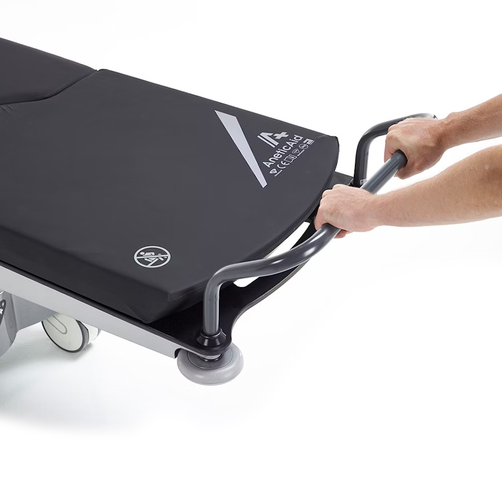 Eine optionale Infusionsstange erweitert die Versorgungskapazität bei intensivmedizinischen Anwendungen, während grössere Laufrollen (Ø 200 mm) die Mobilität auf unebenem Gelände oder bei schwerer Beladung verbessern. Das abklappbare Monitorgestell ermöglicht die sichere Befestigung von Überwachungsgeräten in Notfallsituationen.