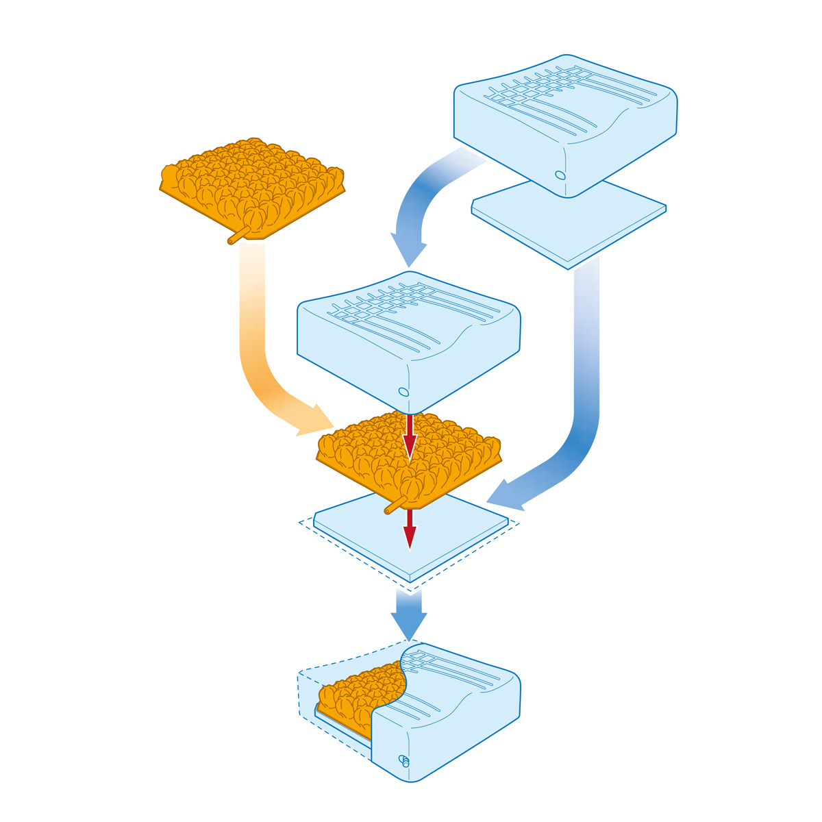 - Passt sich jeder Anatomie an, insbesondere wegen seiner internen Belüftung über ein Kanalsystem, das jederzeit ein schnelles Anpassen des Kissens an die Morphologie des Patienten ermöglicht