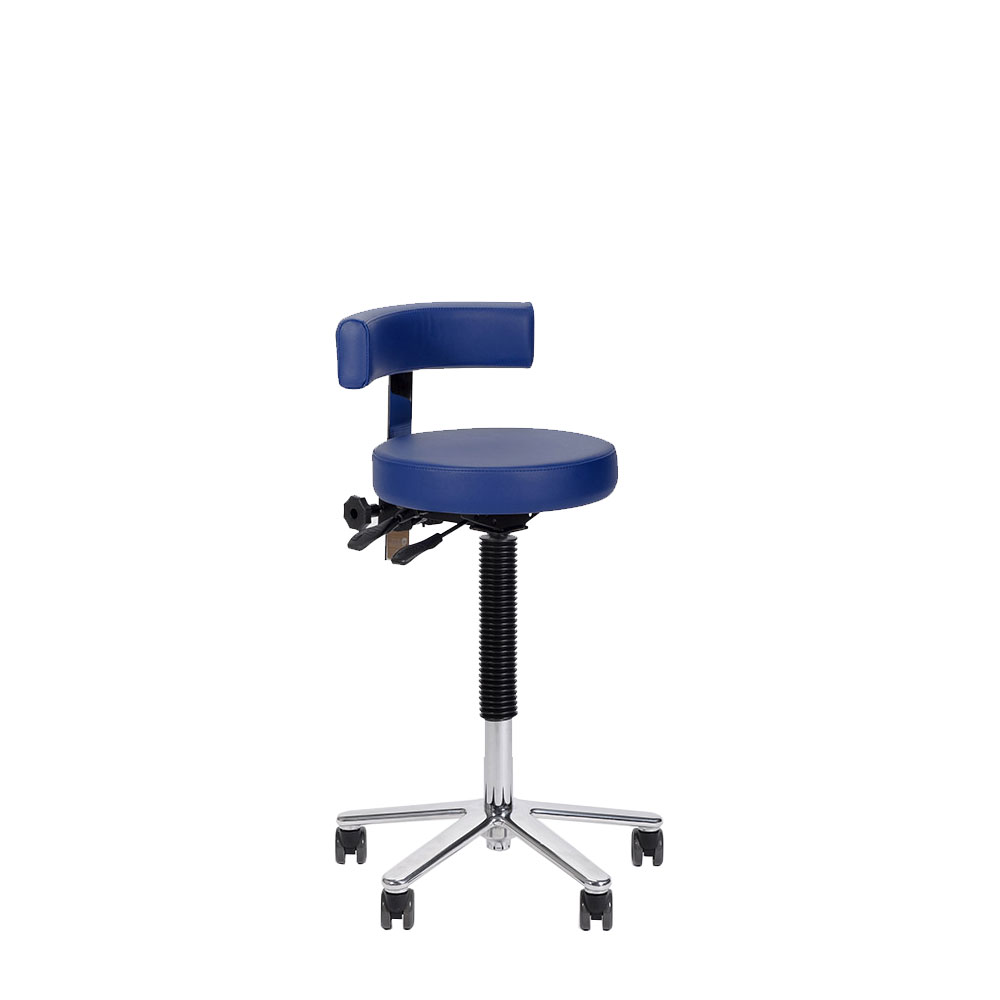 Bequemer Arbetishocker mit Sitz und schmaler Rückenlehne für die Verwendung in Spitälern, Praxen, Pflegeheimen. Der Hocker ist mittels einer Gasfeder höhenverstellbar. Das Fusskreuz ist aus poliertem Aluminium gefertigt und mit grossen Rädern mit weicher Lauffläche ausgestattet. Der Stamskin-Bezug ist blutbeständig und leicht zu reinigen.