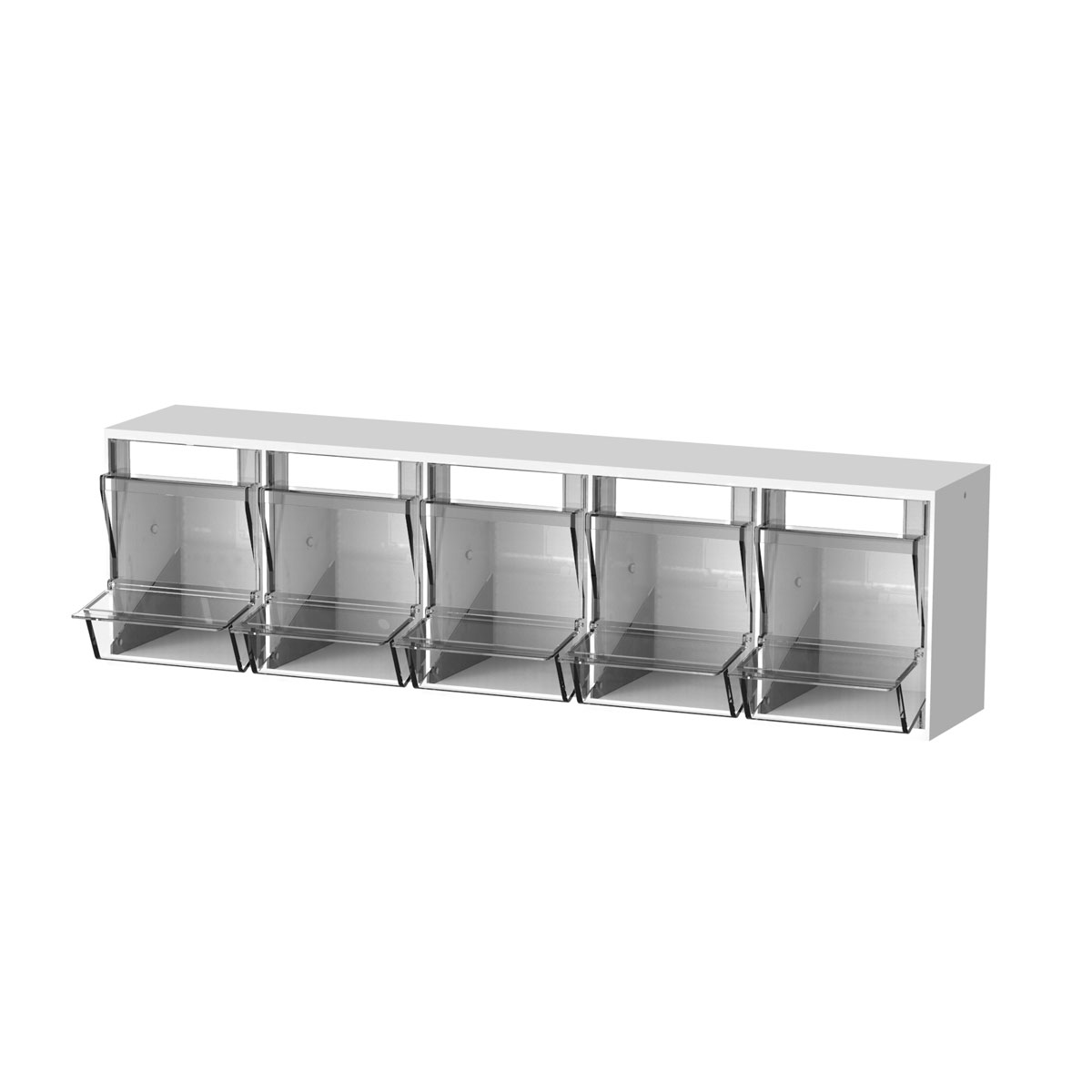 Spritzenspender Wandmodell mit 5 kleinen FIFO Schütten Die Spenderserie mit der First-in/First-out (FIFO) Garantie und Staubschutz nach DlN 58953. Befüllung der Schütten von oben, Entnahme des Materials von unten. Somit wird gewährleistet, dass zuerst eingefüllte Artikel auch zuerst entnommen werden.