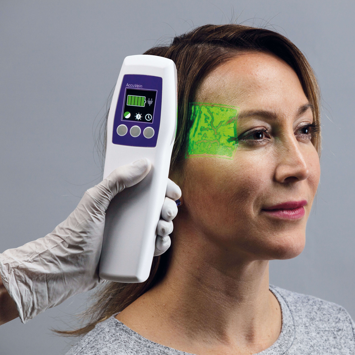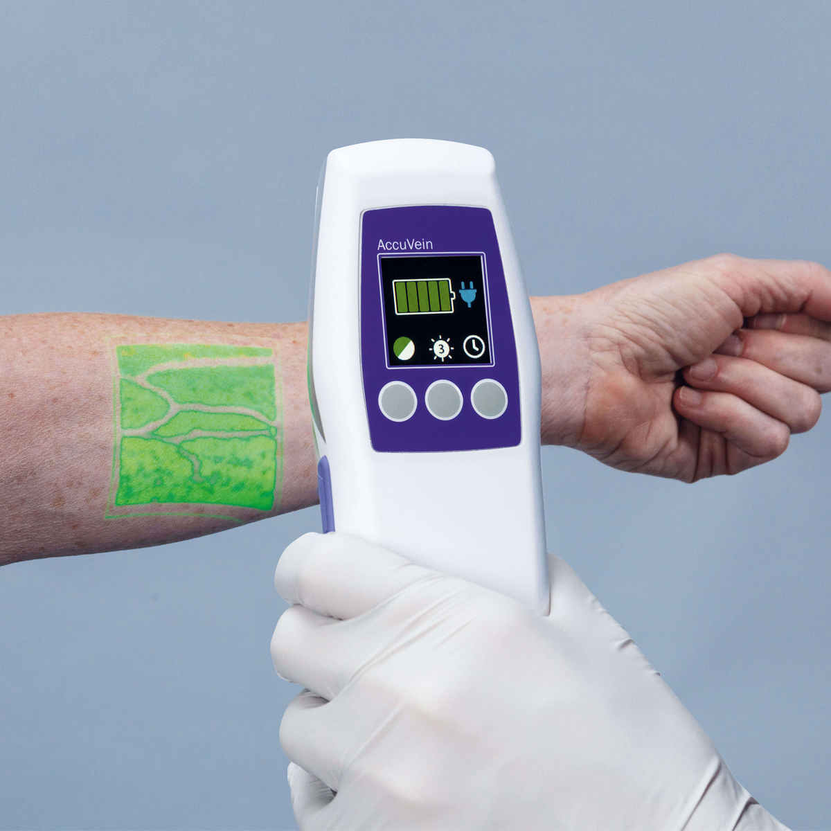 Der Venenfinder AccuVein AV500 bildet mithilfe der Nah-Infrarot-Technologie das venöse Gefässsystem eines Patienten in Echtzeit digital ab. Dadurch können medizinische Fachkräfte das oberflächliche Gefässsystem visualisieren, um Venen für einen optimalen peripheren Venenzugang zu identifizieren oder um Venenpunktierungen bei ästhetischen Eingriffen zu vermeiden. Dank AccuVein werden auch Venenklappen und Gefässverzweigungen sofort sichtbar.