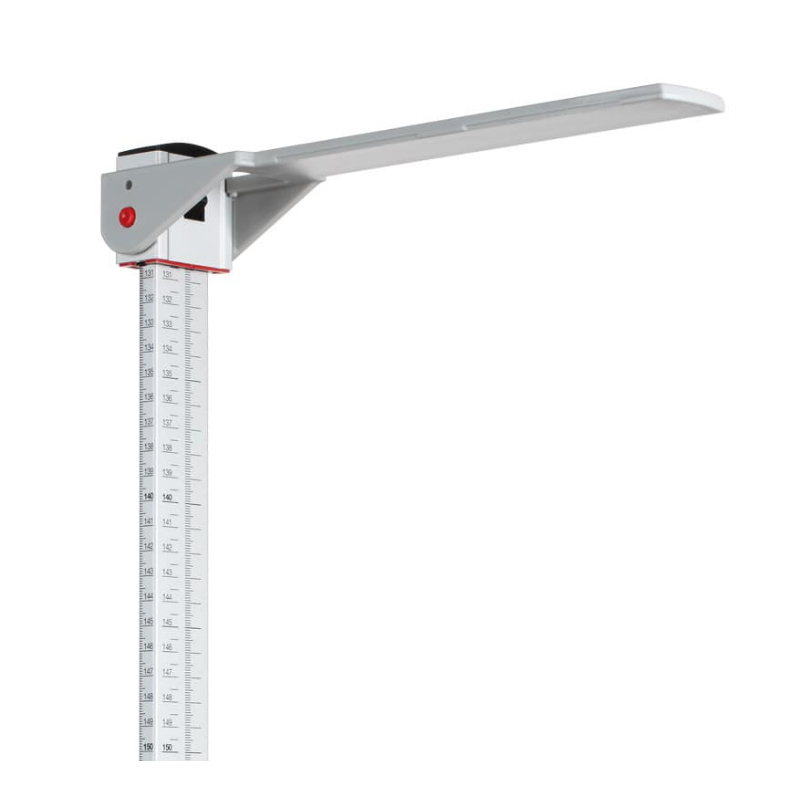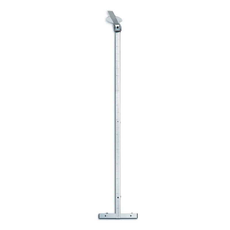 Speziell für die Wandmontage entwickelt, ist dieser Teleskopmessstab von Kopf bis Fuss auf millimetergenaues Arbeiten eingestellt. Sein verbreiterter Messschieber sowie der Fersenanschlag schaffen dabei die professionellen Bedingungen. Der Messstab in Teleskop-Technik sorgt für ein bequemes Ablesen des Ergebnisses: Ab einer Körpergrösse von 130.5 cm wird die Grösse an einer Ablesemarke in dieser Höhe abgelesen. Bei Nichtbenutzung kann der Messschieber aus Sicherheitsgründen weggeklappt werden. Produktdetails des Längenmessstabes zur Wandmontage: