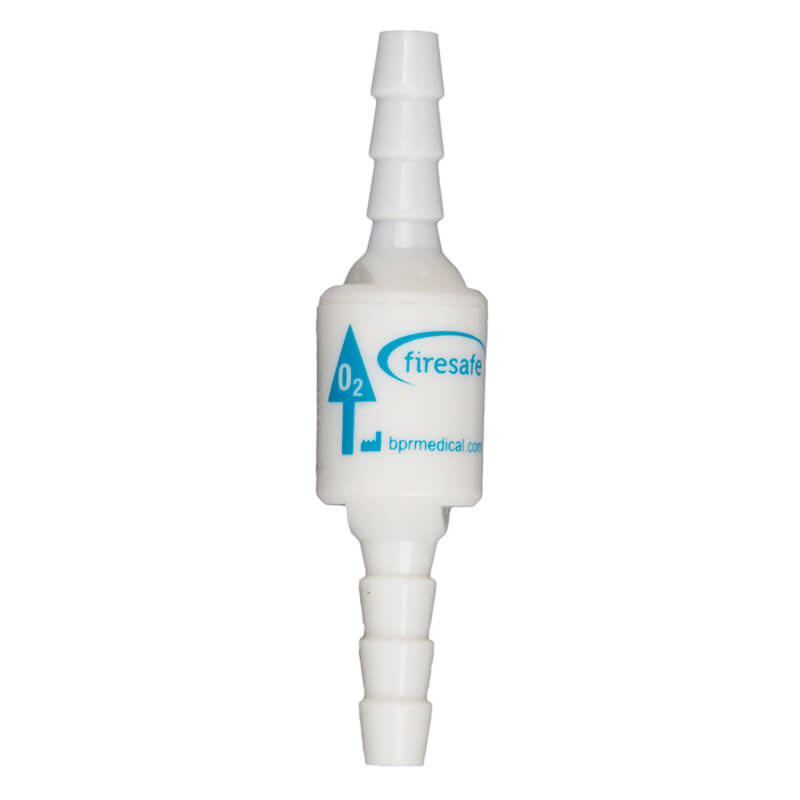 Der Schlauchverbinder Firesafe mit Rückschlagventil wird als Verbindungsstück z.B. von Nasenbrille und Sauerstoffschlauch eingesetzt. Er dient als Sicherung, die den O2-Fluss unterbricht, wenn sich der Sauerstoffschlauch versehentlich entzündet, und somit das Feuer stoppt bzw. erstickt.