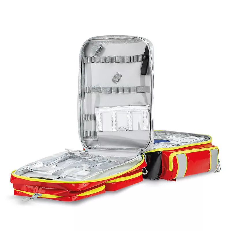 Neben dem grossen Hauptfach mit Trennsteg-Einteilung verfügt der Rucksack innen über sechs Modultaschen, die für eine schnelle Übersicht und optimale Organisation in unterschiedlichen Farben eingefasst sind. Die Mittelwand besitzt zahlreiche Gummischlaufen in verschiedenen Grössen, sowie Klarsichtfächer. Drei Seitentaschen ermöglichen einen schnellen Zugriff z.B. auf Blutdruckmessgerät, Stethoskop, Verbandmittel oder Abwurfbehälter. Ein Dokumentenfach ist seitlich zugänglich. Auf der Front befindet sich eine Flauschfläche sowie ein Klarsichteinschubfach zur einfachen Beschriftung des Rucksacks.Die Einteilung des Notfallrucksacks Lifebag XL umfasst:
