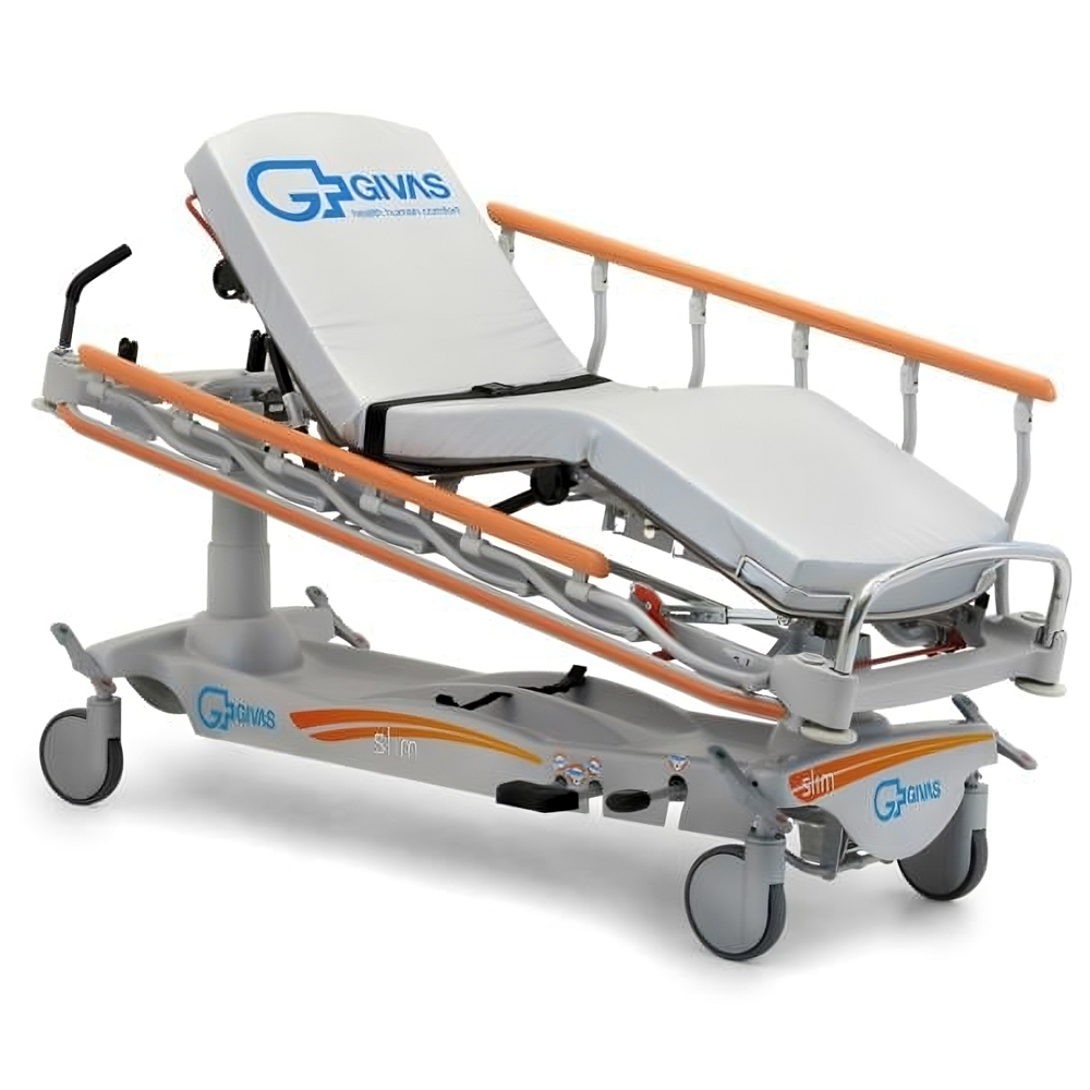 Die Patienten-Transportliege SLIM mit 4 Sektionen (Knieknick) inkl. Matratze bietet dank ihrer hydraulischen Höhenverstellung auf 2 Säulen eine optimale Anpassung für den sicheren und komfortablen Patiententransfer. Klappbare Seitenschienen und die Trendelenburg-Funktion gewährleisten maximale Sicherheit und Flexibilität in Notfallsituationen. Die robuste Stahlstruktur mit Epoxidpulverbeschichtung sorgt für hohe Widerstandsfähigkeit gegen mechanische Beanspruchung und Desinfektionsmittel – perfekt für den anspruchsvollen Spitalalltag. Produktdetails der Patienten-Transportliege SLIM mit 4 Sektionen: