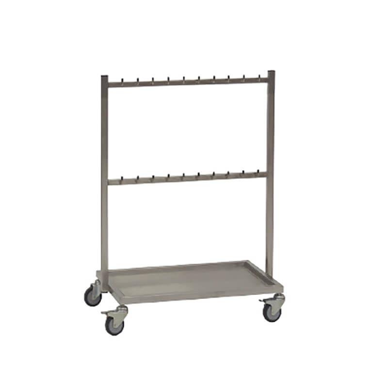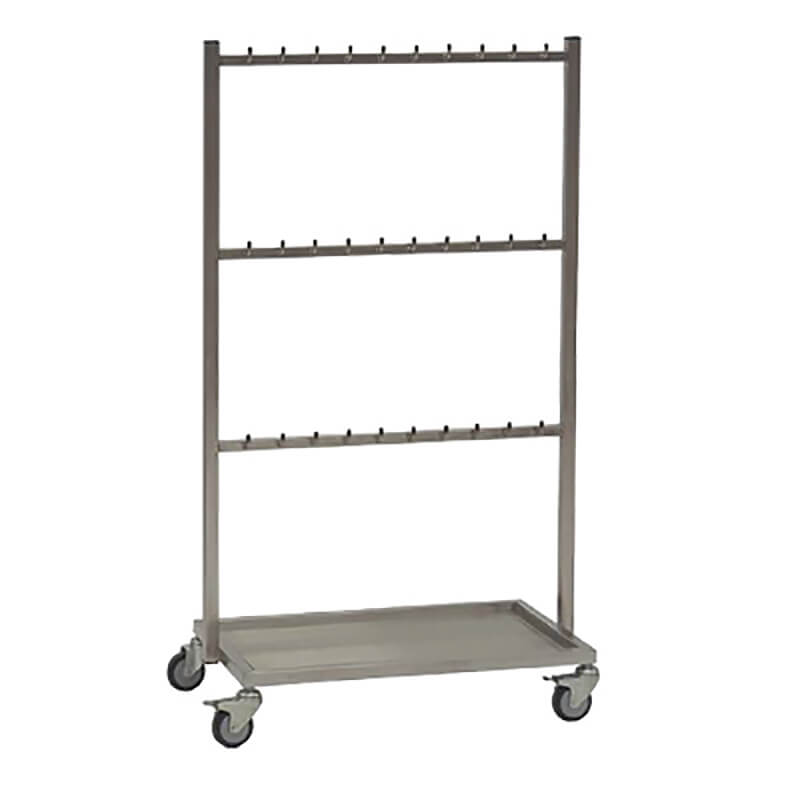 Der Bauchtuchwagen aus Edelstahl mit zwei oder drei Querstreben und 10 Haken pro Strebe ist bestens geeignet für die Lagerung bzw. den Transport von Bauchtüchern im täglichen Spitalbetrieb. Die Edelstahlbodenwanne mit einer Aufkantung von 30 mm schützt die sauberen Bauchtücher vor Verunreinigungen.