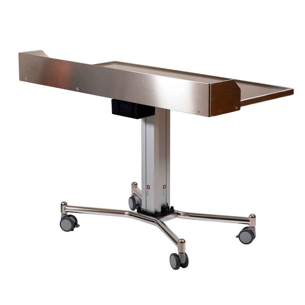 Der hochwertige, rostfreie Instrumententisch aus Edelstahl ist für hohe Lasten geeignet und elektrisch mit einer Taste höhenverstellbar (Akku inklusive). Er ist erhältlich in zwei verschiedenen Abmessung. Die optionale Absturzsicherungen ist als Zubehör verfügbar und dient zum Beispiel, um Leiter bei Endoskopie-Untersuchungen zu halten.