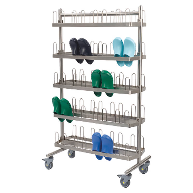 Der praktische Regalwagen aus Edelstahl ist geeignet für 40 Paar Schuhe und kann von beiden Seiten bedient werden.
