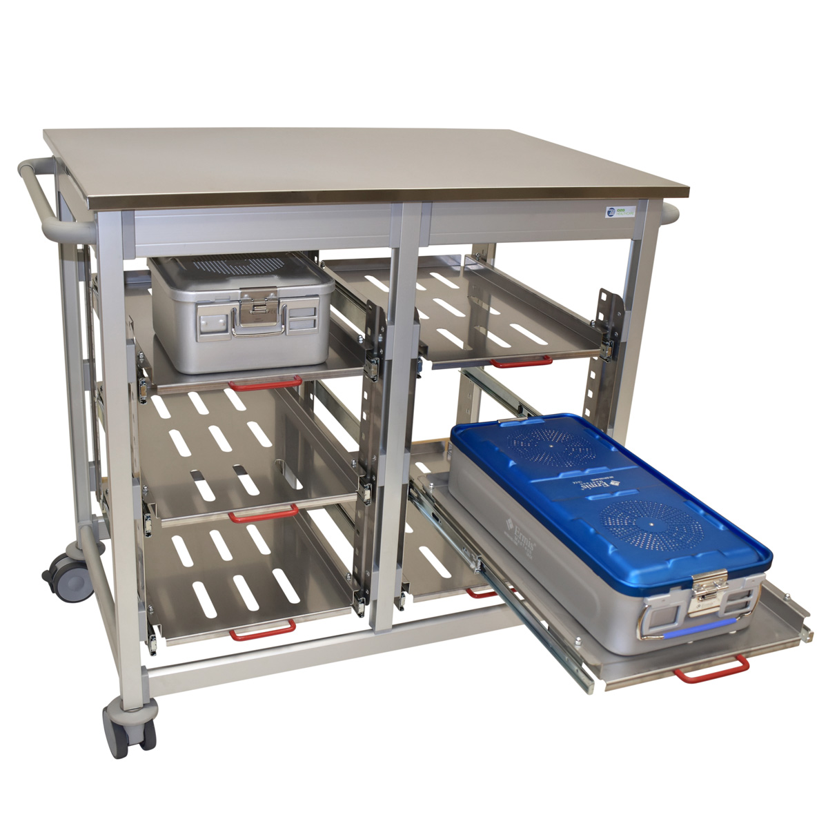 Workstation Fallwagen 2-fach aus einer stabilen Aluminiumkonstruktion, ideal geeignet für 6 Sterilcontainer (Höhe der Container je 20 cm). UU-Typ mit einer Abmessung von