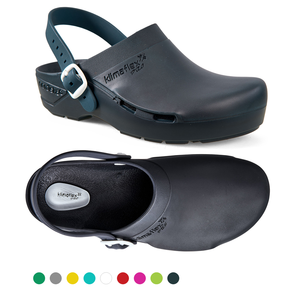 Der Klimaflex PRO AIR GEL inklusive Fersenriemen überzeugt mit einem weichen Gel-Polster im Fersenbereich, für den weichsten Auftritt im Arbeitsalltag. So eignet er sich auch ideal für Personen mit Fersensporn. Zudem bietet der Clog dank ESD Zertifizierung erstklassige antistatische Eigenschaften, kommt mit einer verbesserten Rutschhemmung und Hydrolysebeständigkeit. Natürlich besitzt auch dieser OP-Clog der KLIMAFLEX PRO Familie das bewährte ergonomische Fussbett mit perfekter Passform, welche die natürliche Anatomie des Fusses nachempfindet und den Fuss in besonderem Masse stützt. Die überdachte Seitenbelüftung optimiert das Fussklima und das schockabsorbierende Material steigert das Laufvergnügen.