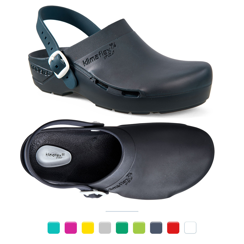 Der Klimaflex PRO AIR GEL inklusive Fersenriemen überzeugt mit einem weichen Gel-Polster im Fersenbereich, für den weichsten Auftritt im Arbeitsalltag. So eignet er sich auch ideal für Personen mit Fersensporn. Zudem bietet der Clog dank ESD Zertifizierung erstklassige antistatische Eigenschaften, kommt mit einer verbesserten Rutschhemmung und Hydrolysebeständigkeit. Natürlich besitzt auch dieser OP-Clog der KLIMAFLEX PRO Familie das bewährte ergonomische Fussbett mit perfekter Passform, welche die natürliche Anatomie des Fusses nachempfindet und den Fuss in besonderem Masse stützt. Die überdachte Seitenbelüftung optimiert das Fussklima und das schockabsorbierende Material steigert das Laufvergnügen.