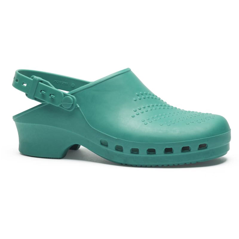 Der Clog verfügt über einen verstellbaren Fersenriemen und das antistatische Material vermeidet eine elektrische Entladung. Zudem entsprechen die Clogs den Sicherheitsansprüchen für Arbeitsschuhe.