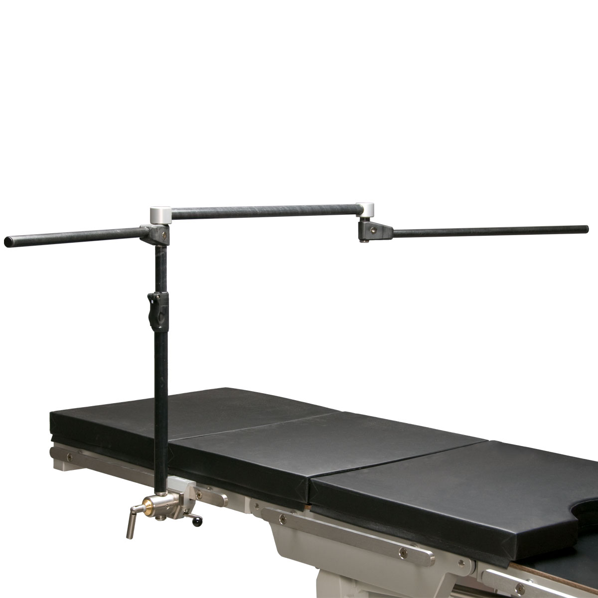 Sehr leichter Narkosebügel aus Karbon mit Verlängerungsarm inkl. rotierbaren Kloben mit Schnellspannklaue. Zur Befestigung an der Normschiene eines OP-Tisches. Der innere Teil des unteren Verlängerungsarms ist als Tragegriff für den Transport geformt.