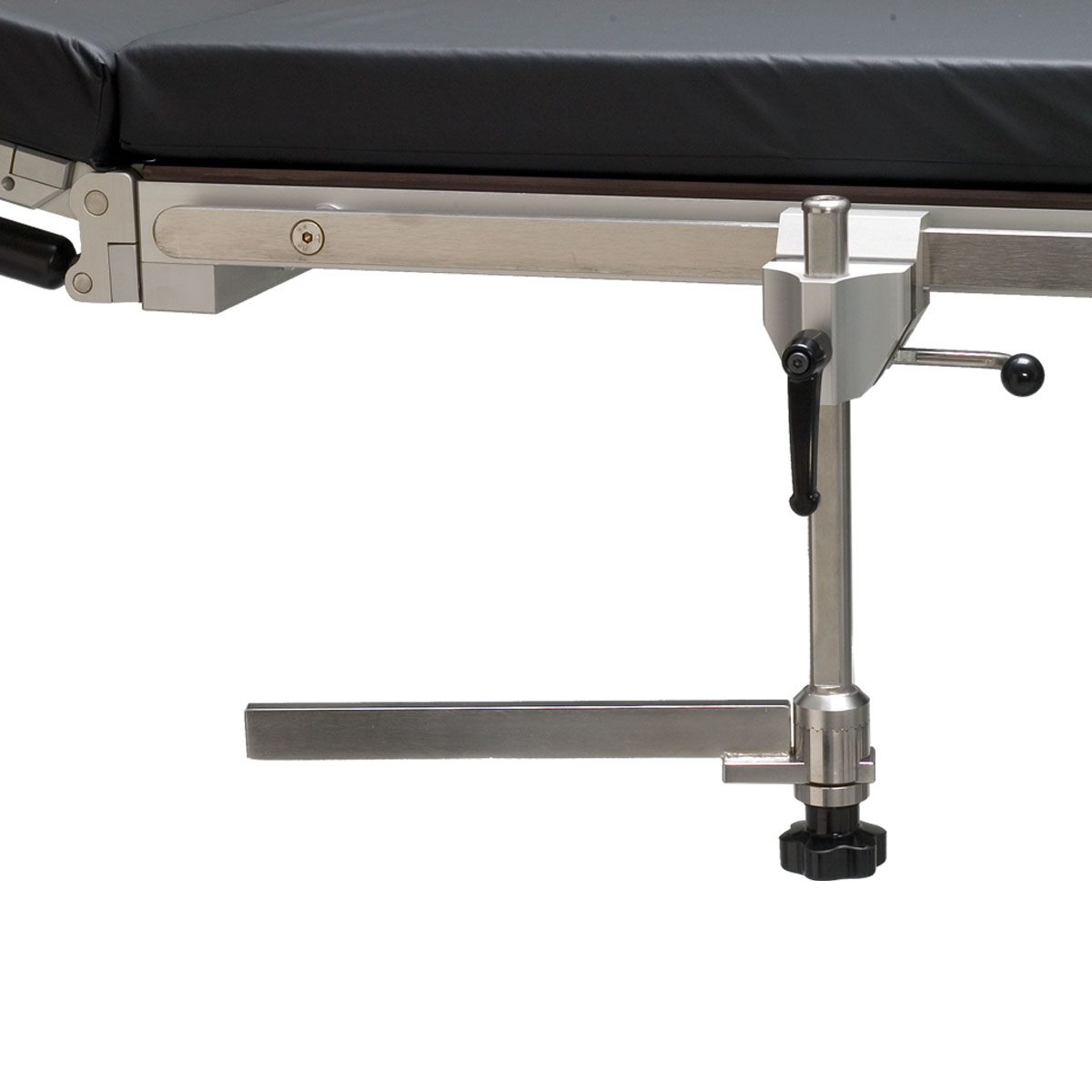 Zusätzliche Normschiene (25×10 mm) mit Kloben (25×10 mm) für OP-Tisch. Diese eckige Zubehörschiene dient zur Verlängerung der normalen Schiene auf einem Operationstisch. Auch wenn ein Zubehörteil seitlich oder schräg vom OP-Tisch angebracht werden muss, passt die winkelförmige Zubehörschiene hinein. Sie lässt sich in der Höhe verstellen und die Schiene selbst ist rundum drehbar und arretiert alle 15°.