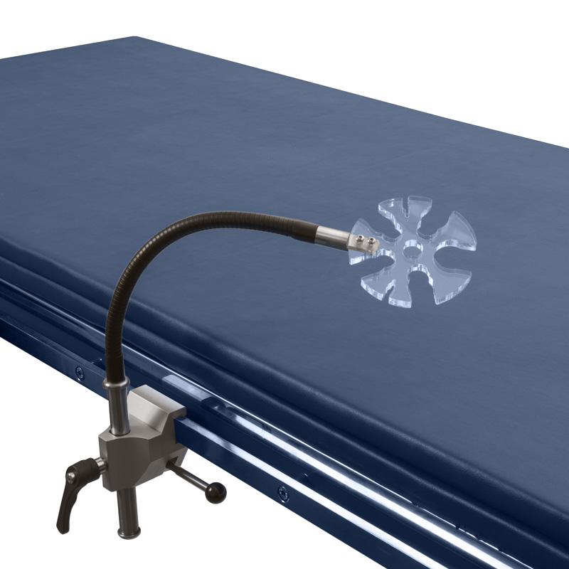 Die Flex-Schlauchhalterung "Robus" dient zur Befestigung an der OP-Tisch Normschiene. Die aus PMMA-Kunststoff gefertigte "Blume" ist besonders stabil und bietet Steckplätze für Schläuche verschiedenster Abmessungen. Beschreibung