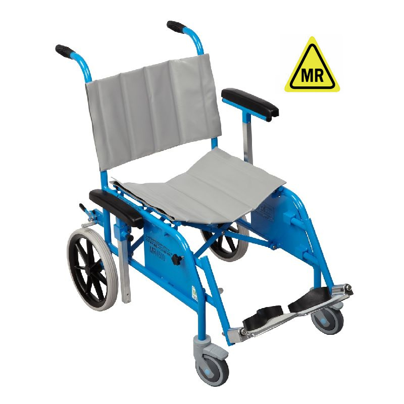 Der antimagnetische Faltrollstuhl besteht aus einer speziellen Aluminiumlegierung und ist dadurch 100 % MRT-tauglich bis 7 Tesla. Als zertifizierter MRT Transportstuhl kann er bedenkenlos an den Magneten geschoben werden, ohne Sicherheitsabstand.Die Armlehnen sind höhenverstellbar oder können auf Niveau der Sitzfläche versenkt werden. So kann der Patient bei Bedarf seitlich auf den Sitz rutschen. Die Fussstützen sind in der Höhe verstellbar und können eingeklappt werden. Sowohl Vorderräder (Lenkräder), als auch die Hinterräder sind einzeln feststellbar. Dies erlaubt ein sicheres Ein- und Aussteigen der Patienten.Die Handhabung des Stuhls ist sehr einfach und leicht, denn er kann mit nur einem Handgriff zusammengeklappt werden. So lässt er sich bei Nichtgebrauch auch in kleinen Praxen oder beengten Räumlichkeiten bequem verstauen.
