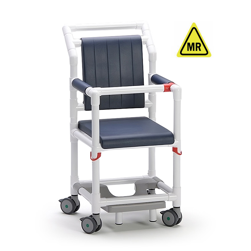 Der nicht-magnetische Transportstuhl eignet sich ideal für den Transfer von Personen hin zu MRT-Räumlichkeiten. Er ist aus nicht-magnetischen Materialien hergestellt und einsetzbar für MRTs mit bis zu 3 Tesla. Der Schiebegriff auf ergonomischer Höhe erleichtert das Schieben des MRT Transportstuhls. Ein Sicherheitsbügel verhindert das Herauskippen der Person. Beidseitig schwenkbare Armlehnen ermöglichen den seitlichen Zugang in den Stuhl hinein bzw. aus dem Stuhl heraus.