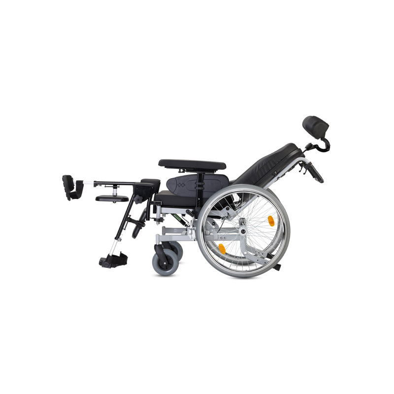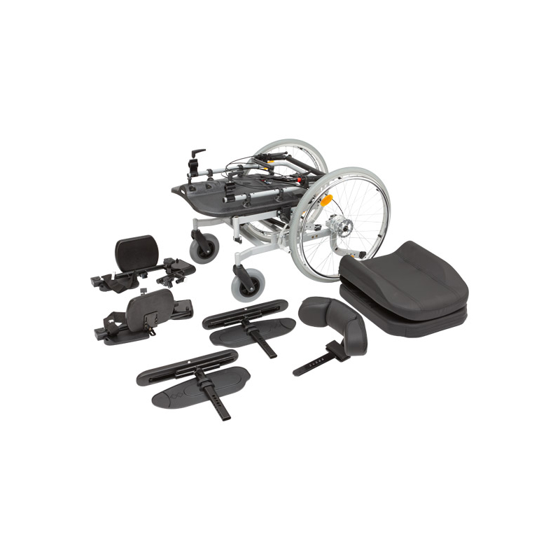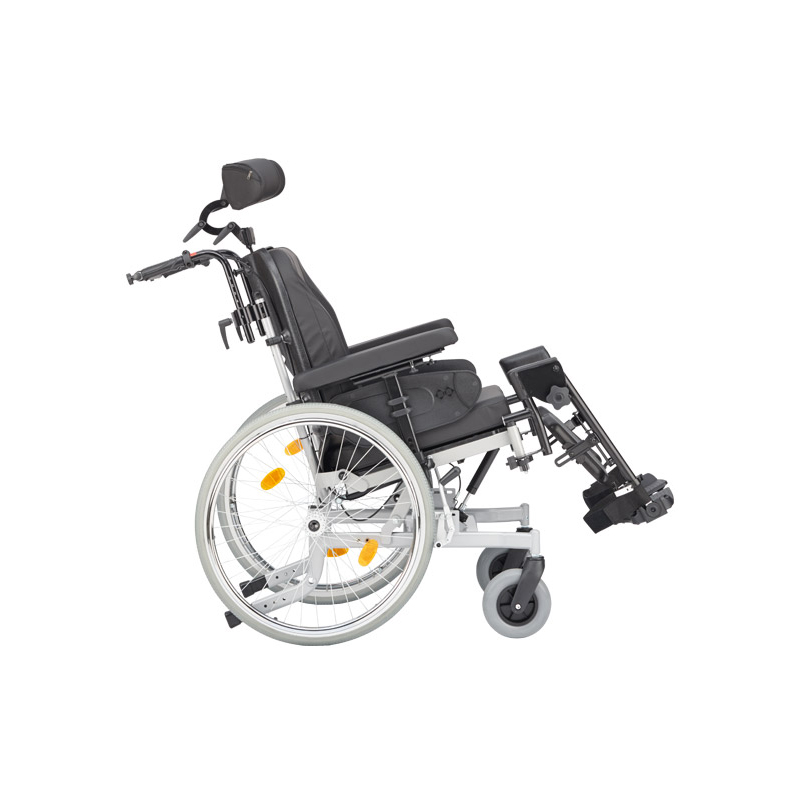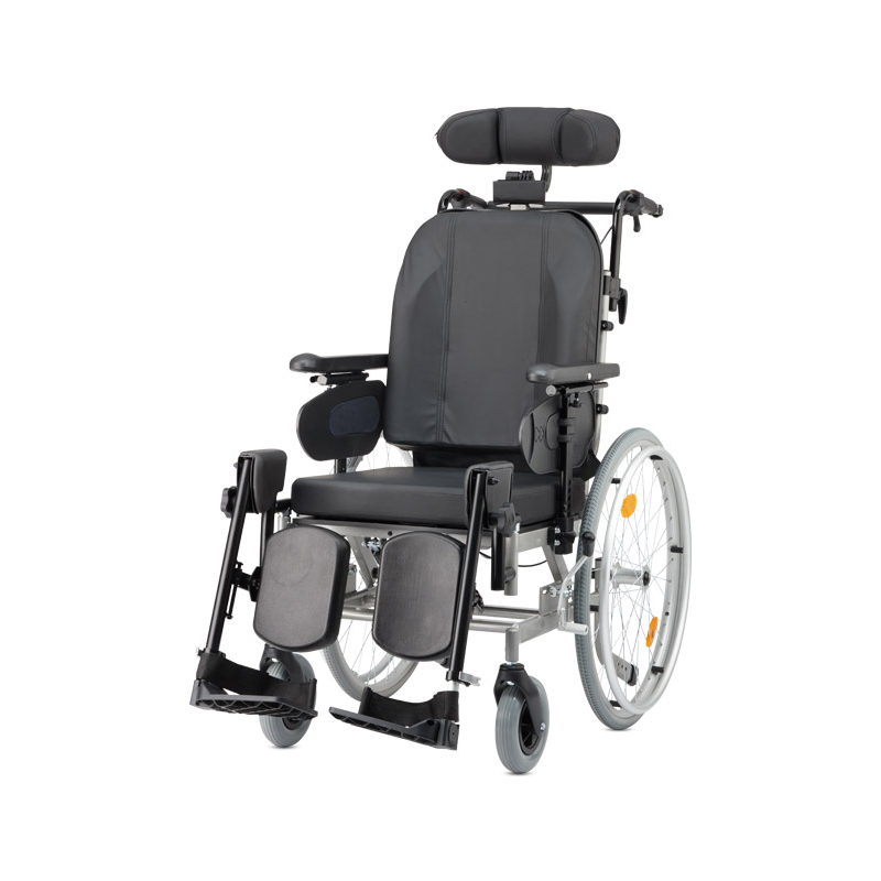 Die 3-fach verstellbare Kopfstütze, die höhen- und tiefenverstellbaren Seitenteile und die waagerecht verstellbaren Beinstützen mit manuellem Längenausgleich bieten weitere Anpassungsmöglichkeiten. Für noch mehr Beinfreiheit liegen hier die Beinstützenaufnahmen ausserhalb des Sitzrahmens.