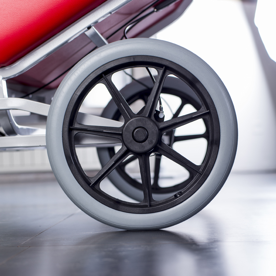 - Räder: 2 Vollgummi-Reifen mit 360° drehbarer Vorderrolle (150/30 mm), 2 Vollgummi-Hinterreifen (400/40 mm)