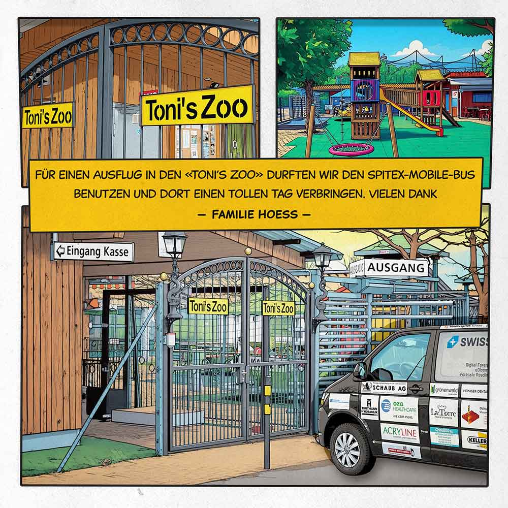 Familie Hoess: "Für einen Ausflug in den «Toni’s Zoo» durften wir den Spitex-Mobile-Bus benutzen und dort einen tollen Tag verbringen. Vielen Dank."
