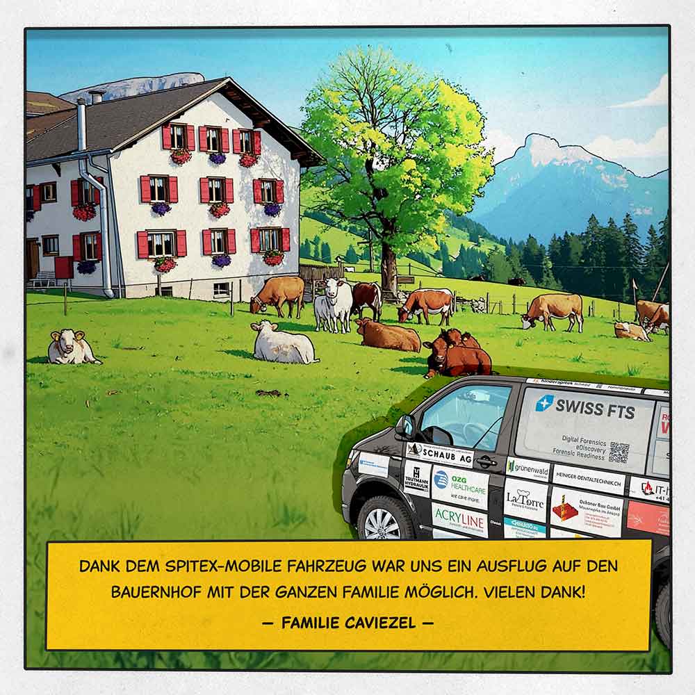 Familie Caviezel: "Dank dem Spitex-Mobile Fahrzeug war uns ein Ausflug auf den Bauernhof mit der ganzen Familie möglich. Vielen Dank!"