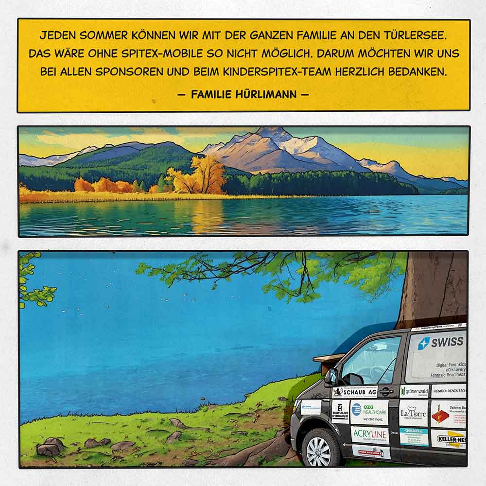 Familie Hürlimann: Jeden Sommer können wir mit unserem Sohn und der ganzen Familien an den Türlersee. Das wäre ohne Spitex-Mobile so nicht möglich. Darum möchten wir uns bei allen Sponsoren und beim ganzen Kinderspitex-Team herzlich bedanken.