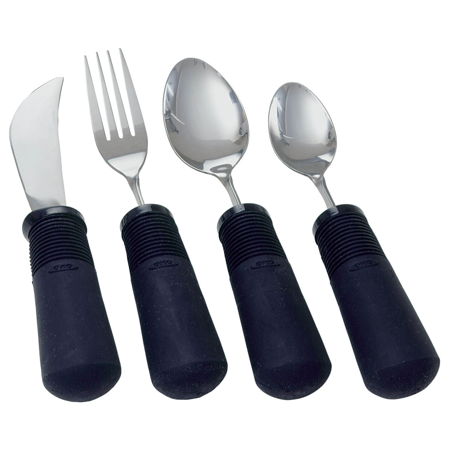 Good Grips ist ein individuell anpassbares Essbesteck mit Antirutsch-Griff für Personen mit Funktionseinschränkungen in Händen oder Gelenken. Der grosse, weiche Griff mit flexiblen Rippen liegt angenehm in der Hand, selbst wenn das Besteck nass ist. Löffel und Gabel lassen sich in jede gewünschte Richtung biegen und sind somit sowohl für Links- als auch für Rechtshänder geeignet. Das Messer ist nicht biegbar.
