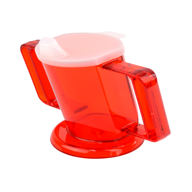 Der schräger Henkelbecher aus Kunststoff (FA) inklusive abnehmbarem Teeaufsatz hat eine schräge Form und extra kräftige Griffe. Die schrägen Seiten des Bechers ermöglichen eine leichtere Flüssigkeitsaufnahme. Durch die spezielle Form kann eine Person den Becher leeren, ohne den Kopf in den Nacken legen zu müssen. Der grosse Boden verhindert ein unabsichtliches Umwerfen.
